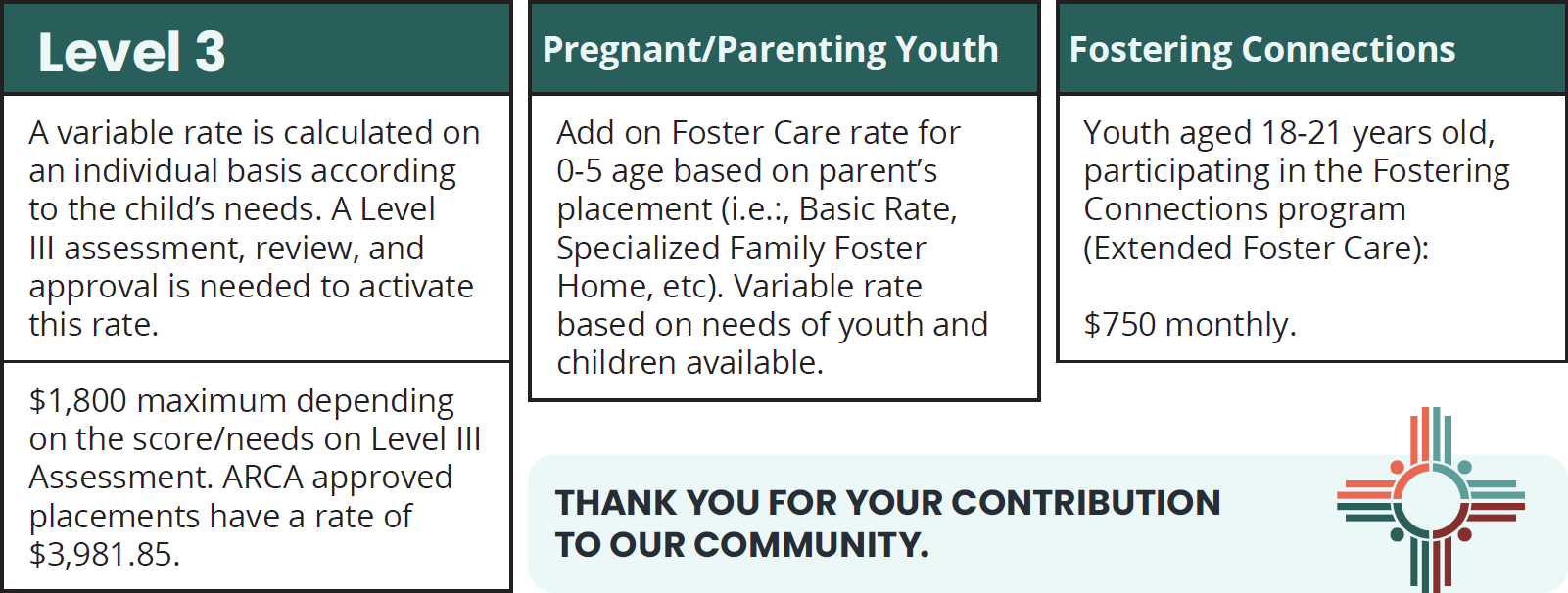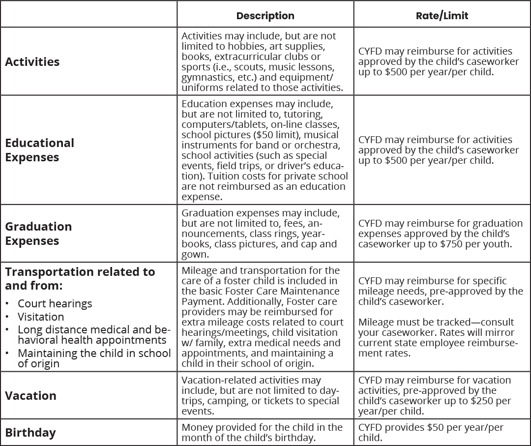 For additional Information about monthly Maintenance Payments, talk to your local caseworker, supervisor, or email Fosteringsupport@cyfd.nm.gov